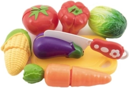 Tato barevná sada pro malé kuchaře nabízí realistický zážitek z vaření. Jednotlivé dílky ovoce a zeleniny jsou spojeny suchým zipem, takže je děti mohou opakovaně rozdělovat a skládat pomocí přiloženého nožíku. Odolné plastové provedení je lehké a bezpečné pro dětské hraní.