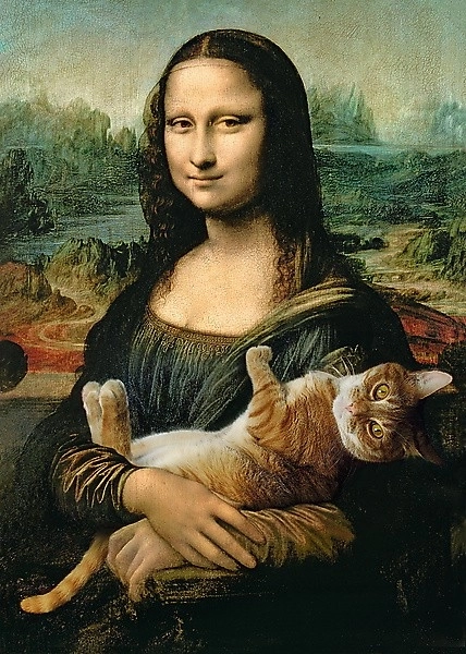 Motiv Mona Lisy s kočkou Mruczkem přidává do klasické umělecké scény zábavný a hravý prvek.