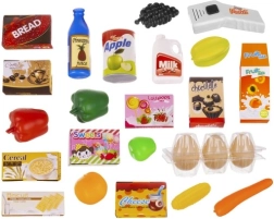 Součástí jsou barevné ovoce a zelenina, nápoje, sladkosti, vajíčka i krabičky s potravinami. Realistické doplňky podporují učení hrou, rozpoznávání potravin a třídění. Stabilní plastové provedení je odolné a bezpečné pro každodenní hraní.