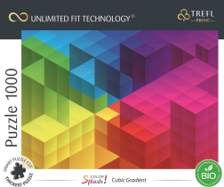 Objevte nekonečné skládání s puzzle TREFL UFT Color Splash v motivu kostkového gradientu o 1000 dílcích. Díky technologii Unlimited Fit Technology lze jednotlivé motivy libovolně propojovat do větších koláží. Puzzle jsou vyrobeny z pevného modrého kartonu, každý dílek má unikátní tvar a složený obraz lze snadno přenášet bez rozsypání. Ekologické bio balení bez plastové folie potěší všechny, kteří myslí na planetu.