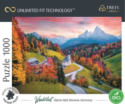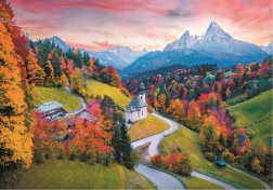 Ponořte se do malebné atmosféry podhůří Alp. Tento motiv s klikatou silničkou, kostelíkem a barevným podzimním listím na pozadí zasněžených hor potěší oko i mysl. Díky technologii Unlimited Fit Technology (UFT) lze jednotlivé obrazy ze stejné série přesně napojovat a vytvářet velké, originální koláže bez omezení.