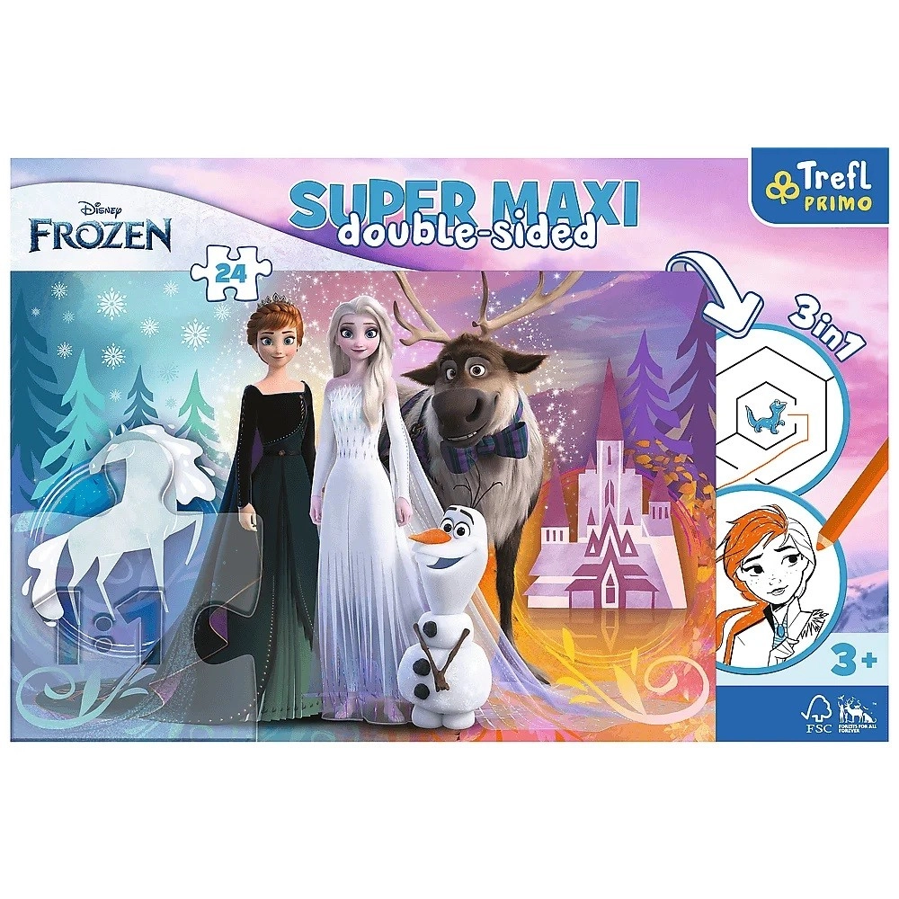 Velkoformátové puzzle Super Maxi 24 spojuje radost ze skládání s kreativitou. Přední strana nabízí barevný motiv z oblíbeného světa DISNEY FROZEN, zatímco zadní strana skrývá omalovánku a jednoduchou hru s vybarvováním – skvělý způsob, jak si děti procvičí soustředění, koordinaci oko–ruka a rozpoznávání tvarů a barev.