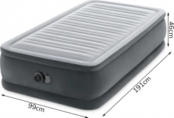 Vestavěná elektrická pumpa nafoukne i vyfoukne matraci během pár minut – bez námahy, čistě a rychle. Odolné PVC s voděodolným, semišovým povrchem zvládne každodenní používání, maximální nosnost je 136 kg. Součástí je přepravní taška pro snadné uložení a přenášení.