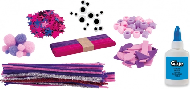 Chlupaté drátky, bambulky, pěnové tvary, korálky, samolepicí očka a třpytivé i klasické lepidlo – ideální kombinace pro nespočet výtvarných projektů.