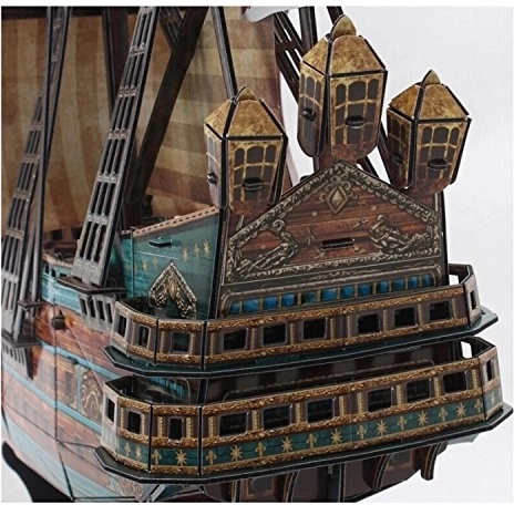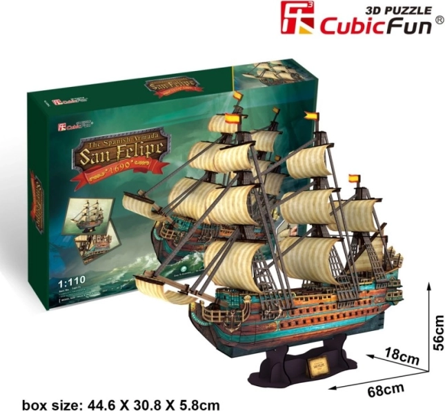 3D puzzle plachetnice San Felipe od značky CubicFun přináší realistický model historické galeony s bohatou výzdobou a promyšlenými detaily paluby. Dílky z cca 3mm pěny potažené laminovaným potištěným papírem do sebe přesně zapadají a umožňují stabilní a atraktivní výsledek bez použití lepidla či nůžek.