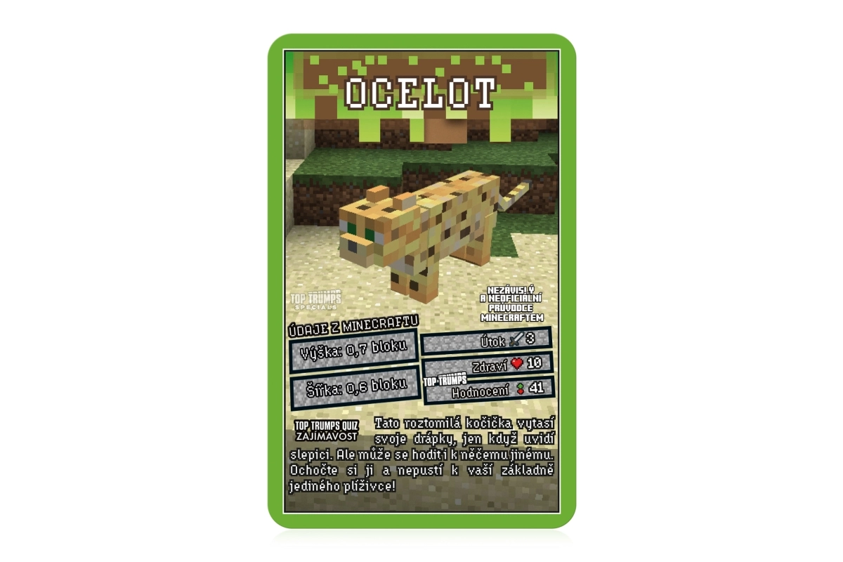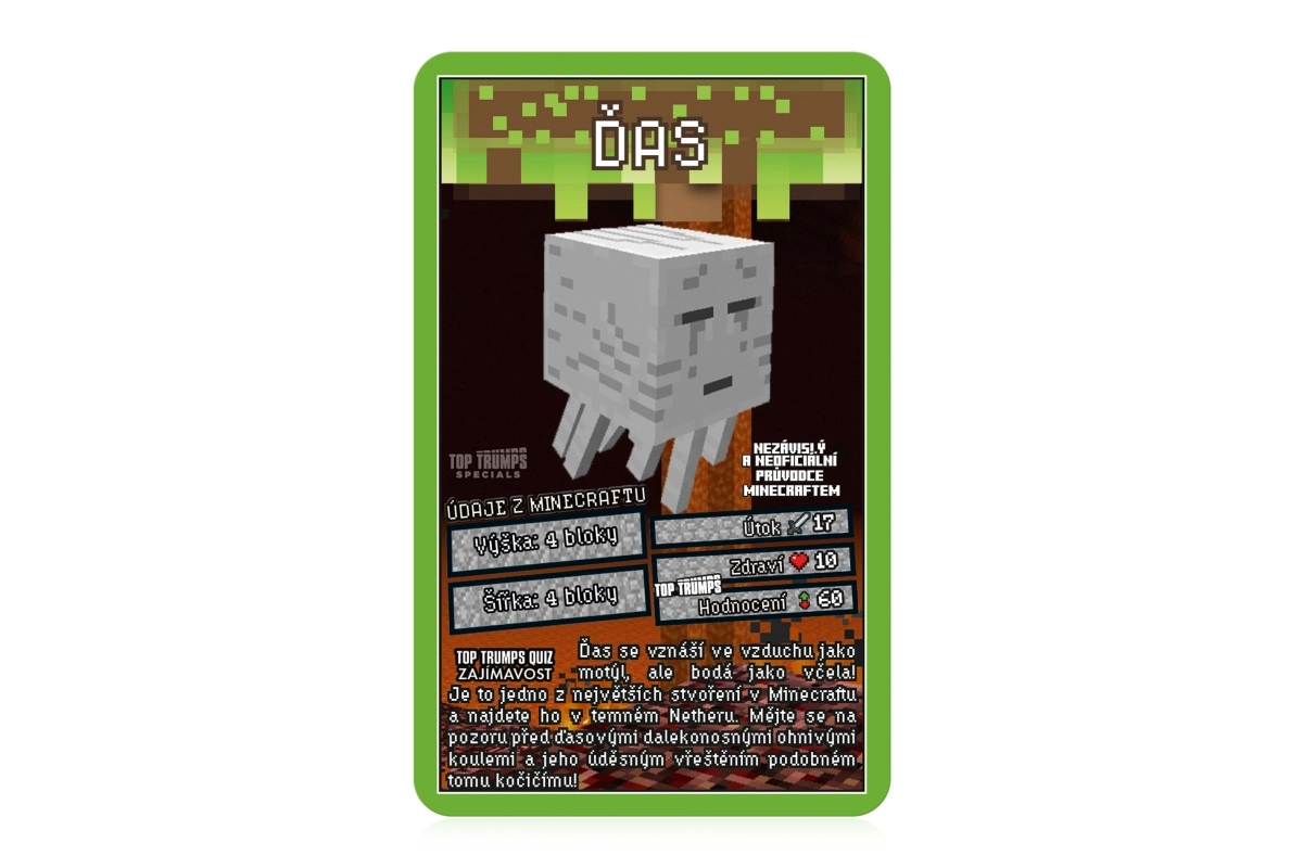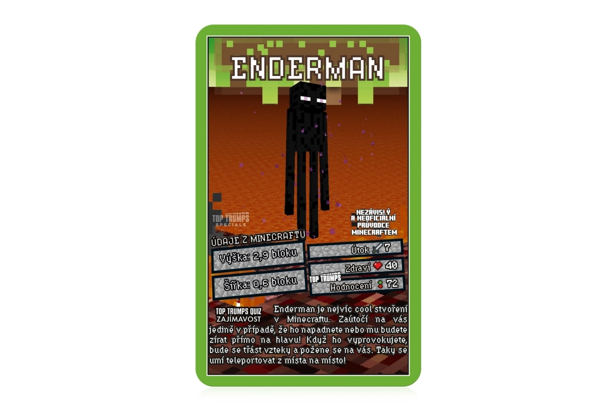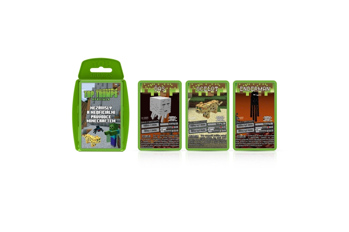 Objevte svět MINECRAFT v legendární hře Top Trumps. Na každé kartě najdete oblíbené postavy a tvory z hry, jejich životy, útočnou sílu a další hodnoty. Vyberte správný atribut, porazte soupeře a získejte jejich karty. Cílem je získat celý balíček a stát se absolutním vítězem.