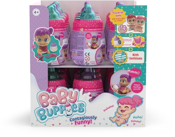 Baby Buppies jsou zábavné sběratelské panenky ve stylovém balení připomínajícím lahvičku. Každé miminko umí realisticky žvatlat a smát se, takže přináší do hry emoce a spoustu legrace. Díky pestrým barvám a roztomilému designu si je děti rychle zamilují.