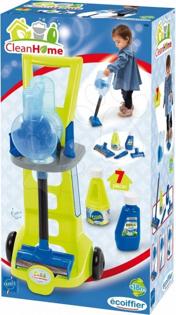 Tento úklidový vozík z řady Ecoiffier je vybaven tyčovým vysavačem s třemi různými nástavci, dvěma čisticími prostředky a vozíkem se dvěma kolečky, které usnadňují přesun celé soupravy na libovolné místo.