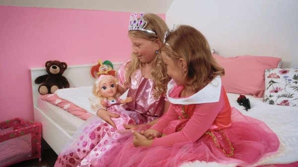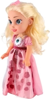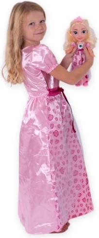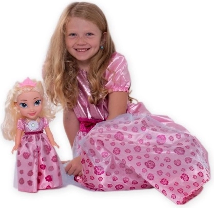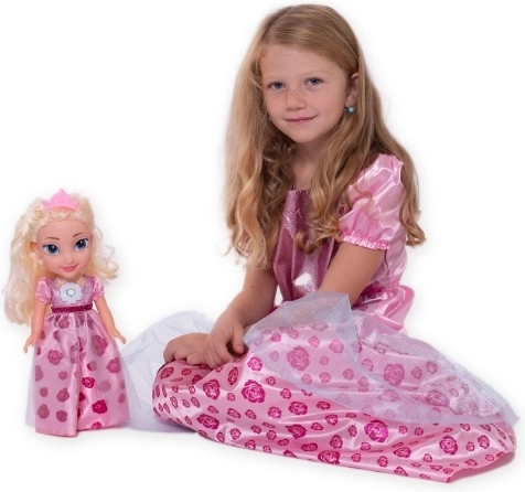 Růžové šaty s třpytivými a květinovými detaily a bohaté vlasy vybízejí k česání a stylování. Panenka se stane hvězdou každého královského bálku.