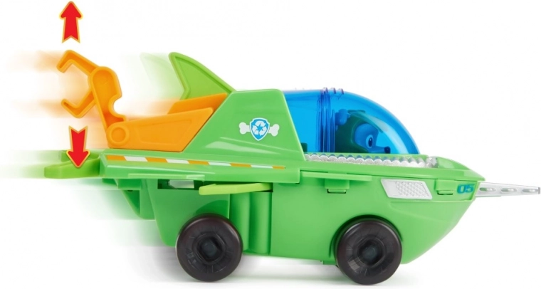 Rocky, odborník na recyklaci z týmu PAW PATROL, přichází v edici Aqua Pups se svým podmořským vozidlem inspirovaným pilorybou. Díky průhledné modré kabině můžete figurku snadno usadit dovnitř a vyrazit na nové vodní mise. Robustní kola umožňují jízdu po zemi a pohyblivý hák přidává další herní možnosti.