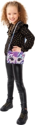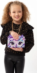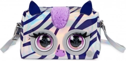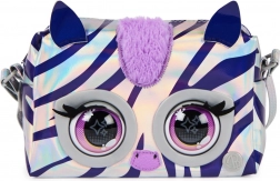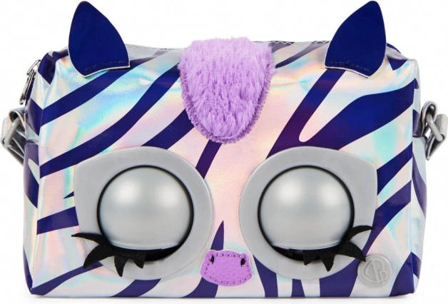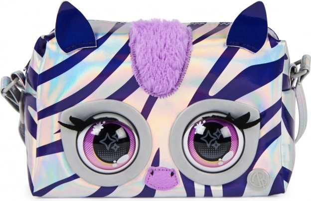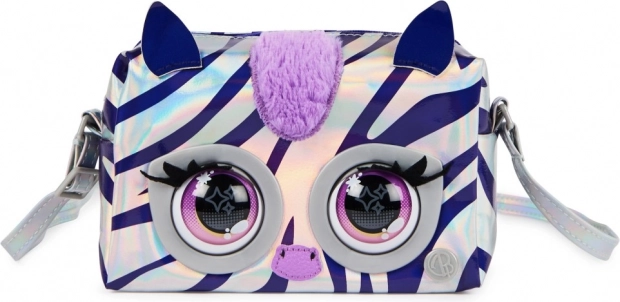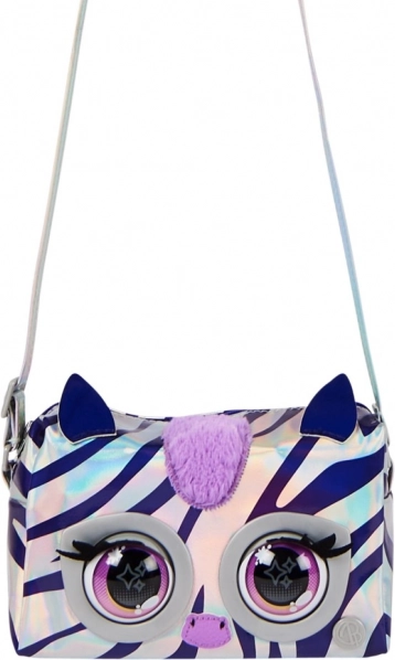 Metalická kabelka z řady Purse Pets potěší děti svým unikátním stylovým designem a interaktivními funkcemi. Kabelka je vyrobena z lesklé stříbrné látky s holografickými fialovými pruhy, které vytvářejí módní vzhled. Díky dotykovému senzoru kabelka reaguje mrkáním a vydává až 30 různých zvuků, což z ní dělá zábavného společníka pro každý den.