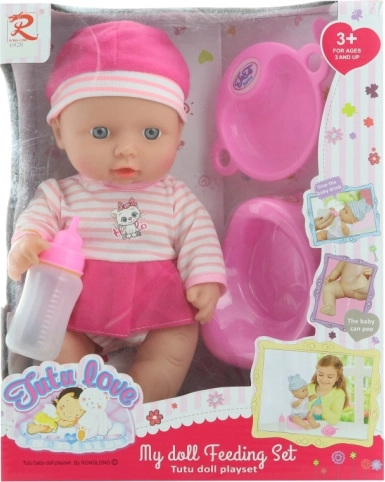 Miminko po vložení baterií vydává zvuky a po napití z lahvičky čůrá – děti si vyzkoušejí opravdovou péči o miminko.
