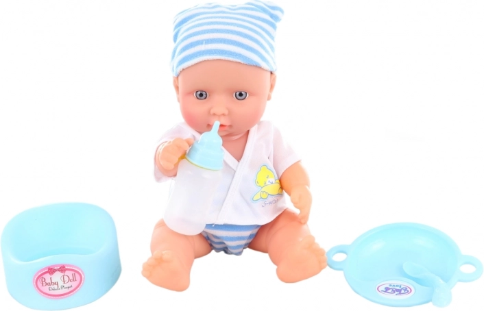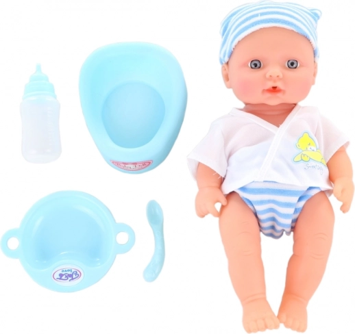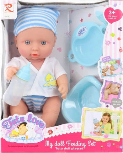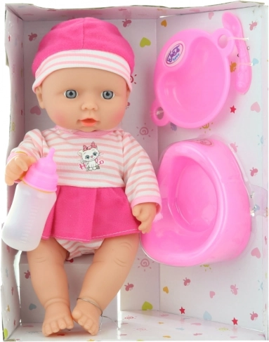 Součástí sady je lahvička, talířek, lžička a nočník, takže děti mohou trénovat krmení i hygienu bez dalších dokupů.