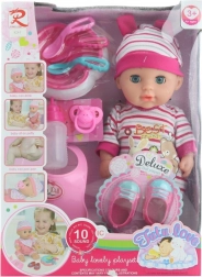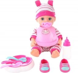 Součástí sady jsou botičky, plastový bryndáček, lahvička, talířek, příbory a další doplňky pro pestrou fantazijní hru.