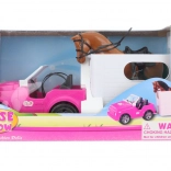 Objevte kompletní herní set pro kreativní hraní: auto pro panenky s přívěsem a koněm. Díky velkému provedení a odolnému plastu je souprava vhodná pro každodenní použití doma i venku. Děti si mohou snadno naložit koníka, vyrazit na závody nebo na výlet a rozvíjet tak fantazii i jemnou motoriku.