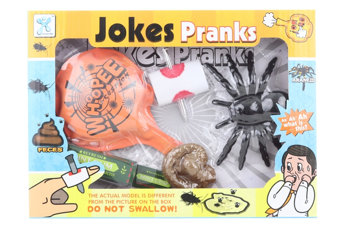 Zábavná sada žertovných předmětů pro malé i velké vtipálky přináší hodiny smíchu a překvapení. Obsahuje prdící polštářek, falešné lejno, pavouka, hřebík s obvazem a žvýkačky s pastičkou. Ideální na oslavy, párty i domácí legraci. Vhodné pro děti od 3 let.