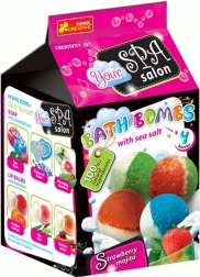 V balení najdete veškeré ingredience i pomůcky pro výrobu 4 barevných bomb – jedlou sodu, kyselinu citronovou, mořskou sůl, přírodní olej, barvivo, rukavice a další. Díky jednoduchému postupu je sada vhodná pro začátečníky i tvořivé děti od 9 let. Skvělý tip na originální dárek a zábavu do deštivých dnů.