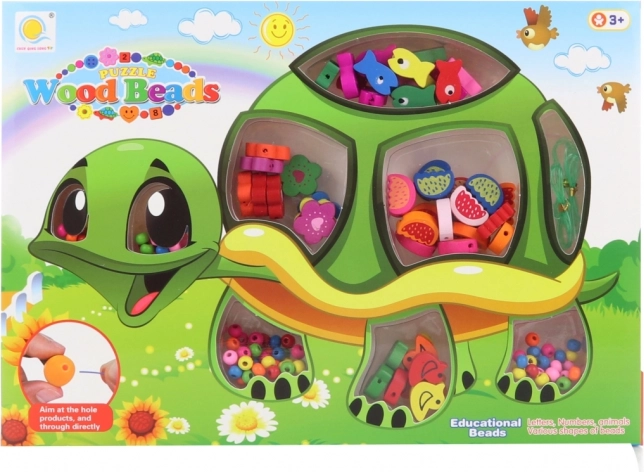 Kreativní sada dřevěných korálků s motivem želvy pro děti od 3 let rozvíjí jemnou motoriku i fantazii. Obsahuje mnoho barevných tvarů a šňůrky na navlékání v praktickém balení cca 28 × 19,5 × 2,5 cm.