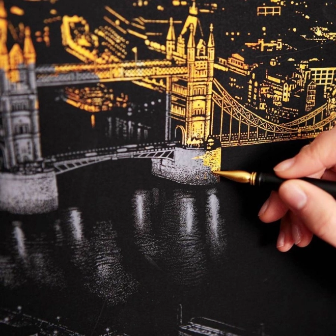 Objevte kouzlo škrabací techniky: pod černou vrstvou se ukrývá zlatý podklad, který z každého vyškrábaného tahu vytváří kontrastní, elegantní efekt. Motiv ikonické Opery v Sydney v nočním provedení potěší začátečníky i pokročilé a výsledný obrázek se stane originální dekorací.