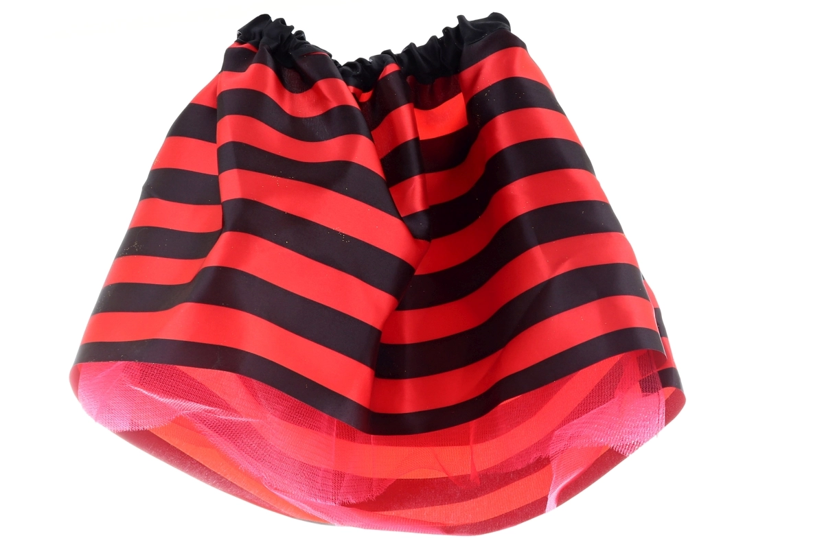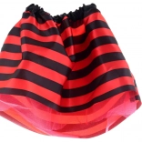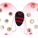 Součástí jsou průsvitná růžovo-červená křídla s třpytivými puntíky, elastická sukně v červeno-černém proužku, čelenka s pružnými tykadly a ladící hůlka se stuhami. Velikost sady je navržena pro děti od 3 let; rozměr balení cca 49 × 57 cm.