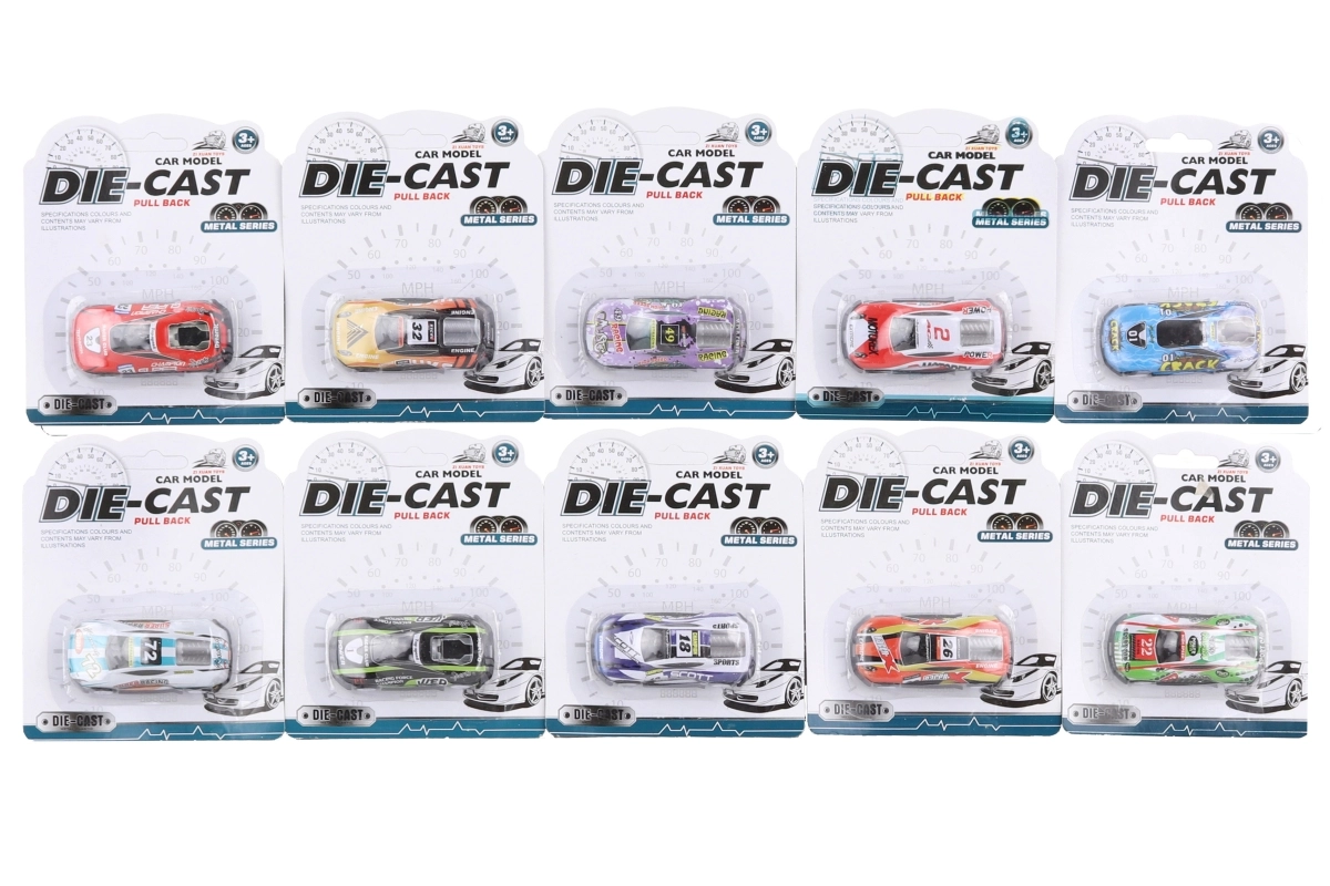 Kompaktní kovové závodní autíčko o velikosti cca 6,5 × 3 cm potěší malé milovníky rychlosti. Díky kovovému provedení je odolné, snadno se ovládá a je vhodné pro děti od 3 let.