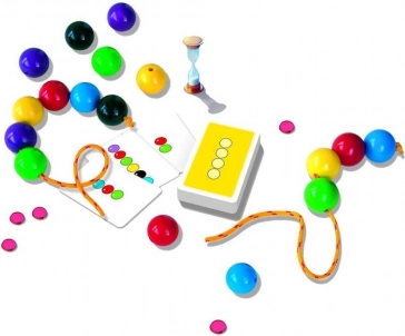 - Balení obsahuje: 55 karet, 18 kuliček, přesýpací hodiny, 3 provázky, 80 žetonů a návod
