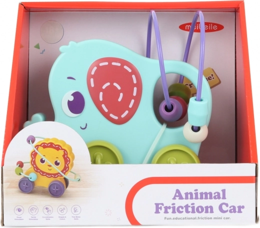 Tento barevný plastový labyrint slon na kolečkách je skvělou motorickou hračkou pro nejmenší. Děti procvičí koordinaci oko–ruka, trpělivost a soustředění, když posouvají korálky po drátcích a pohybují hračkou po podlaze. Díky pevnému a hladkému provedení je hra bezpečná a příjemná na dotek.