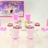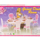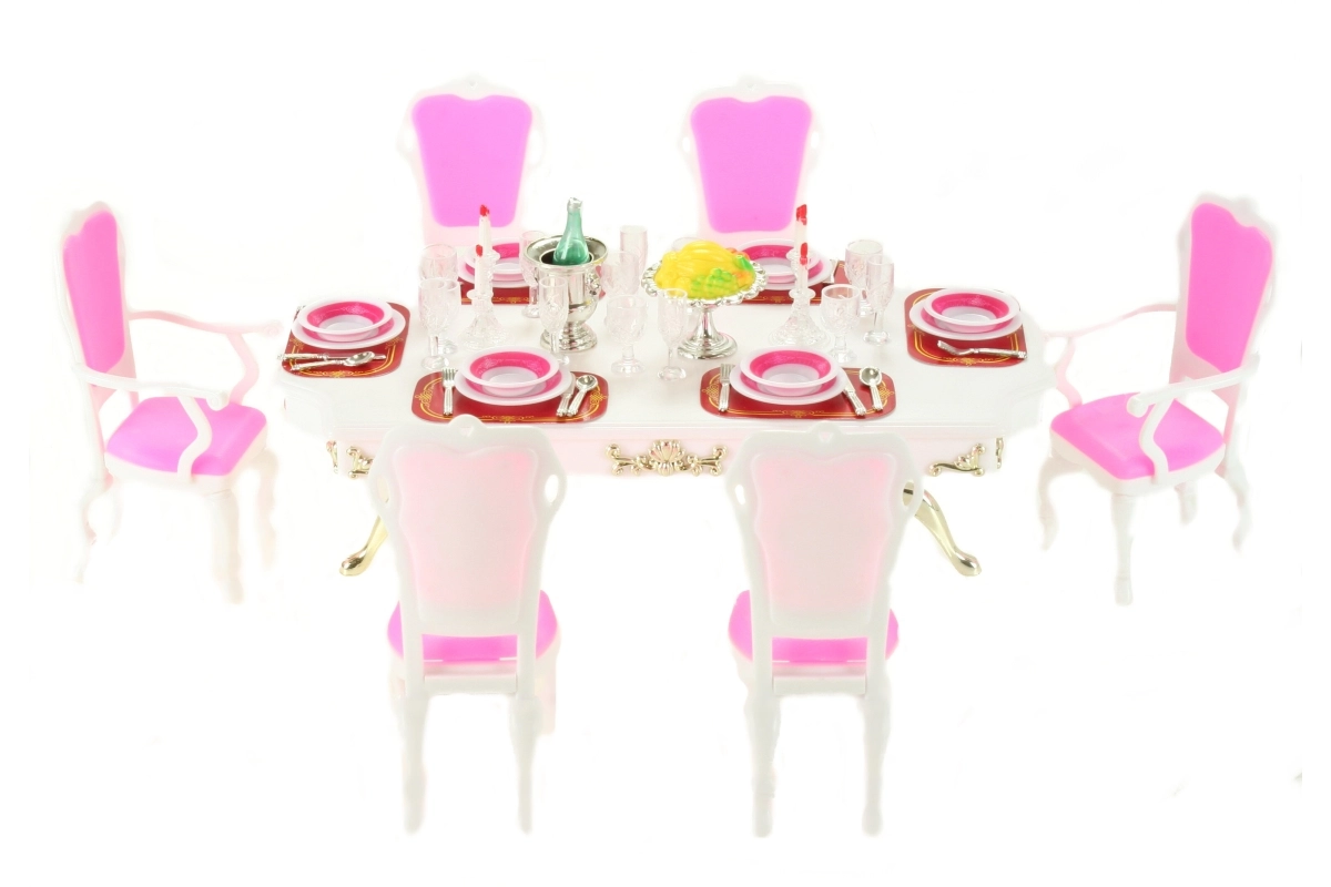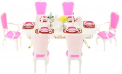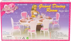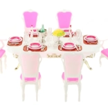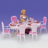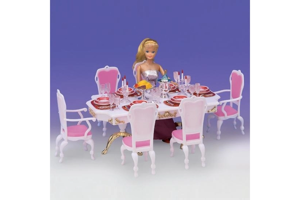 Stylová sada Glorie pro panenkové stolování promění každý pokojíček v elegantní jídelnu. Obsahuje velký plastový stůl, 6 židlí (2 s područkami) a bohaté prostření stolu včetně skleniček, talířů a příborů. Ideální pro kreativní hru dětí od 3 let.