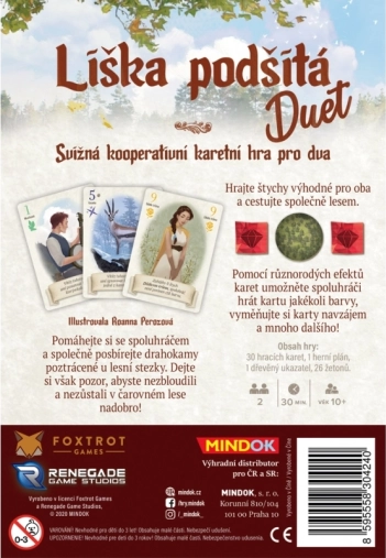 Spolupracujte ve hře Liška podšitá Duet od MINDOK, sbírejte drahokamy u lesní stezky a vyhrávejte štychy výhodné pro oba. Využívejte speciální efekty karet, pomáhejte si správným časováním a nenechte se zlákat čarovným lesem do ztracena.