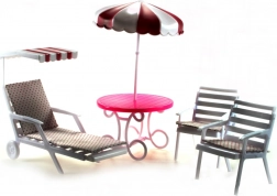 - Plastové lehátko, 2 plastové zahradní židličky, plastový zahradní stolek, slunečník