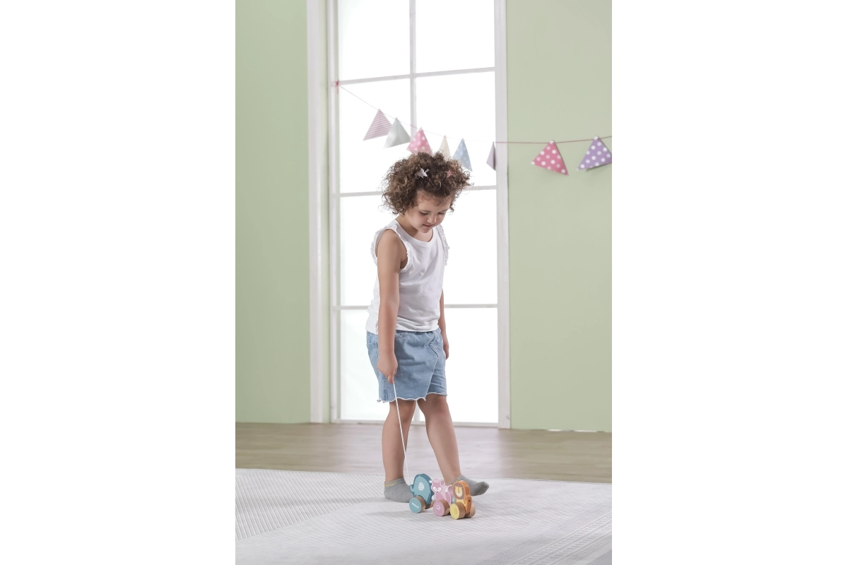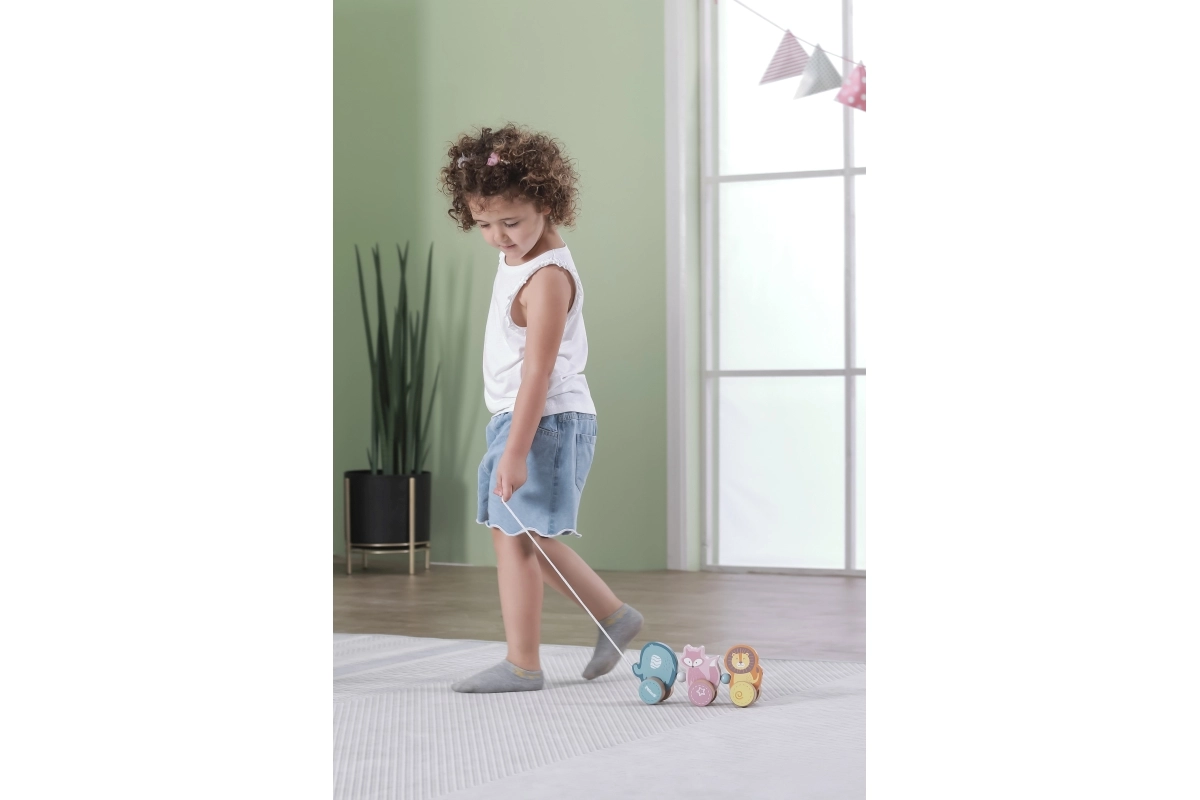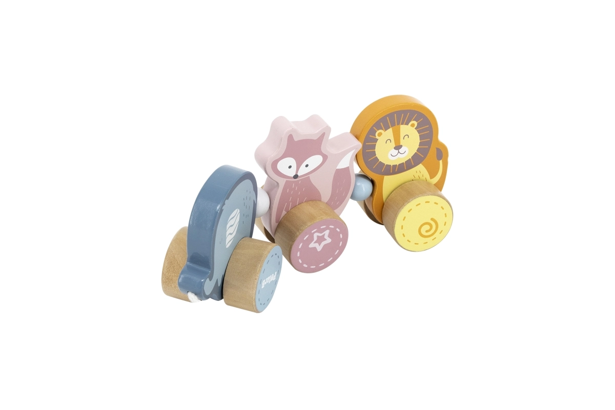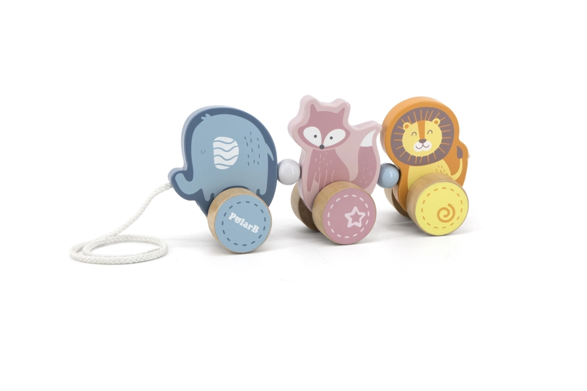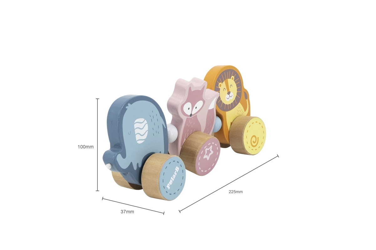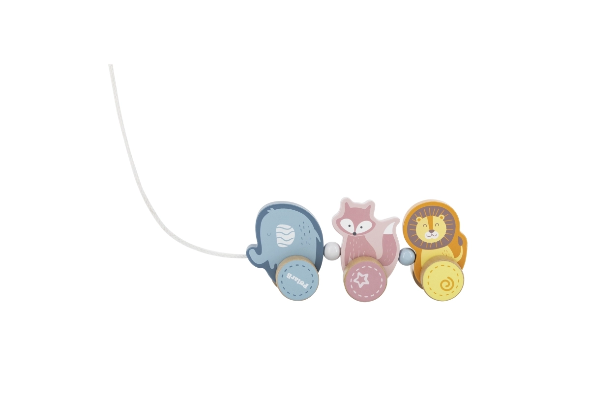 Tato kvalitní dřevěná tahací hračka v jemných pastelových odstínech je navržena pro malé děti, které se učí chodit a objevovat svět. Tři roztomilá zvířátka – slon, liška a lev – jsou propojena a hladce se kutálejí na dřevěných kolečkách. Díky pevnému tahacímu provázku se hračky snadno vedou, motivují děti k pohybu a přirozeně rozvíjejí rovnováhu a koordinaci.