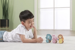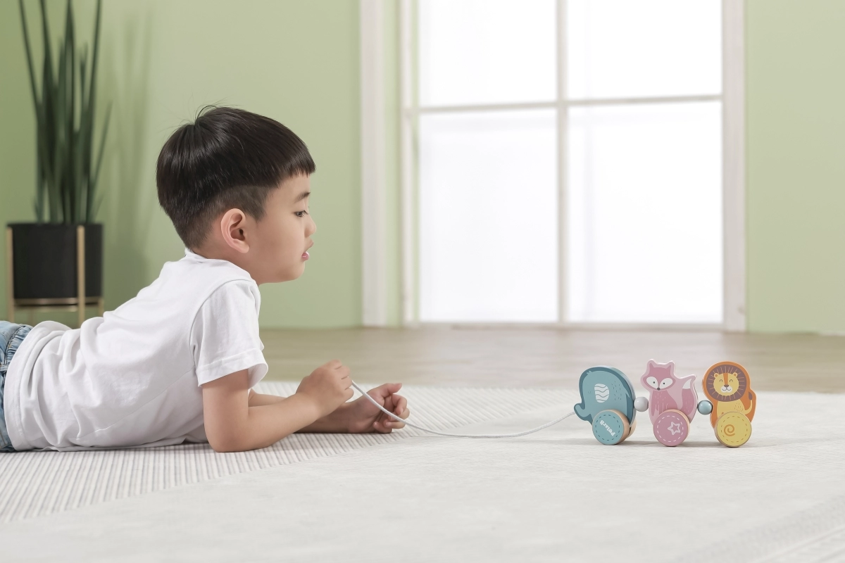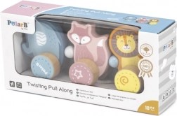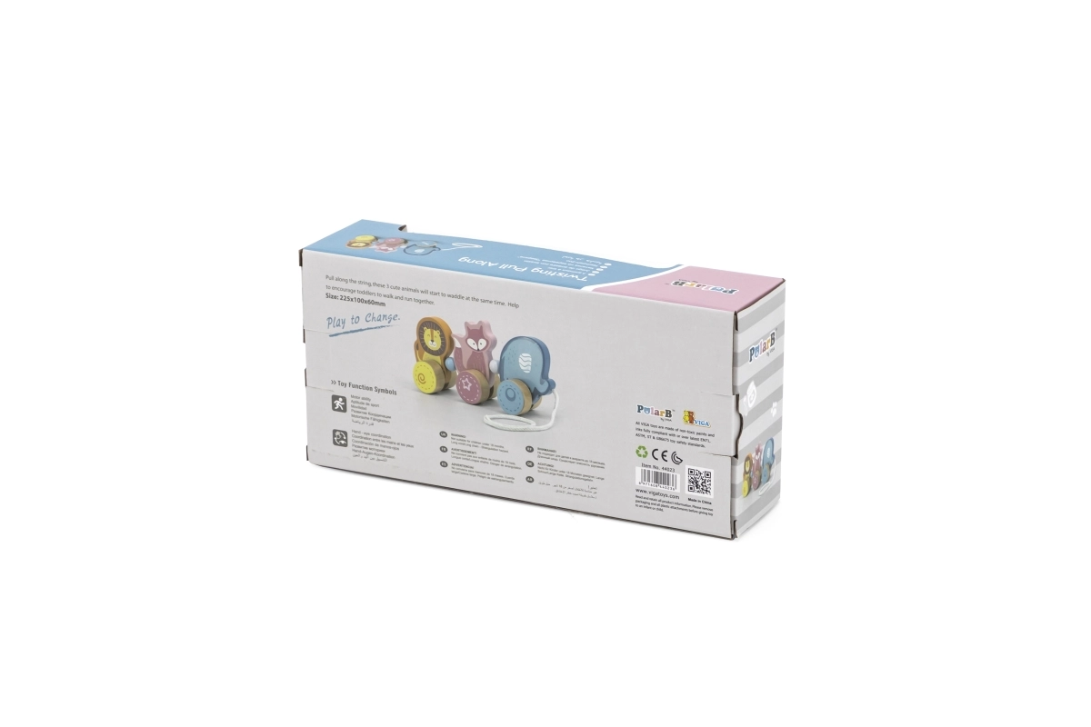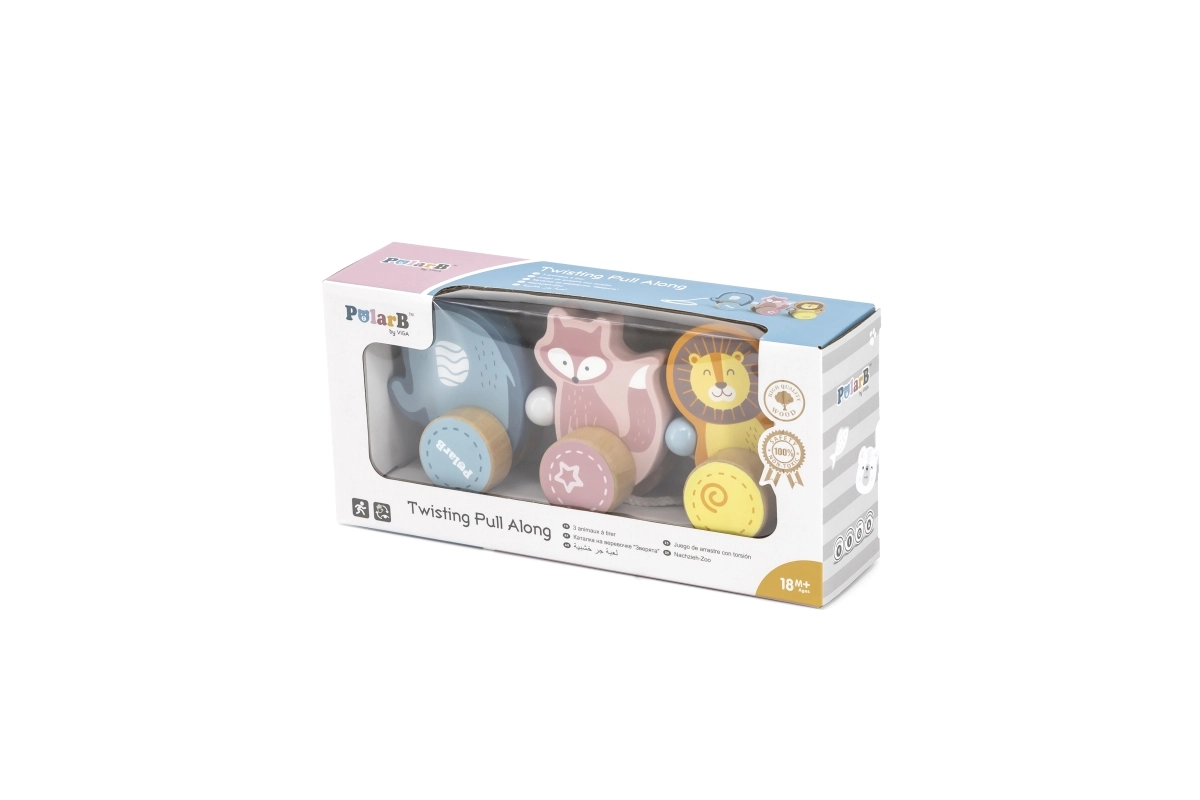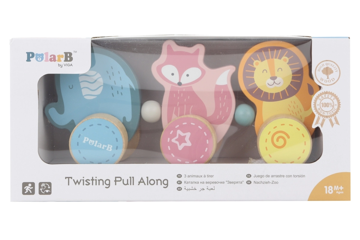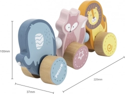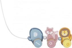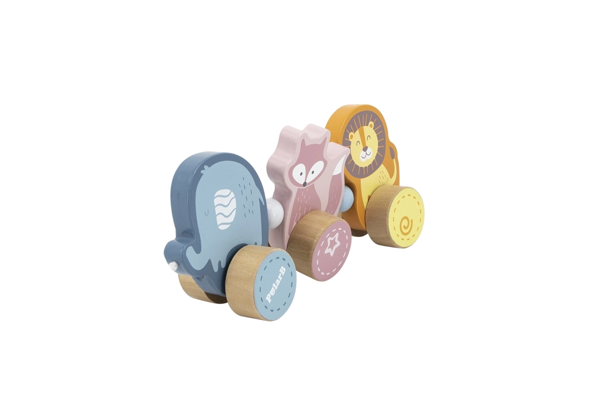 Tato kvalitní dřevěná tahací hračka v jemných pastelových odstínech je navržena pro malé děti, které se učí chodit a objevovat svět. Tři roztomilá zvířátka – slon, liška a lev – jsou propojena a hladce se kutálejí na dřevěných kolečkách. Díky pevnému tahacímu provázku se hračky snadno vedou, motivují děti k pohybu a přirozeně rozvíjejí rovnováhu a koordinaci.