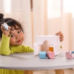 Děti třídí a přiřazují tvary do správných otvorů, čímž si přirozeně osvojují rozpoznávání tvarů a barev i prostorovou představivost.