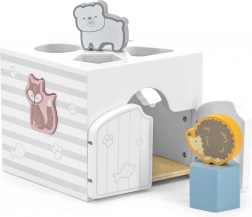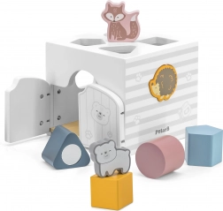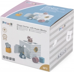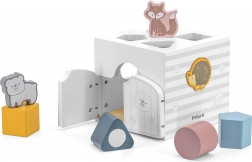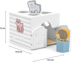 Tato kvalitní dřevěná vzdělávací hračka kombinuje třídění tvarů, zvukové podněty a roztomilý design z řady POLARB. Set obsahuje 7 kostek – 3 základní geometrické tvary s různými zvuky, 3 kostky ve tvaru zvířátek s ilustracemi a jednu kostku se zrcátkem. Děti vkládají tvary odpovídajícími otvory a poté je snadno vyjmou zadními dvířky.