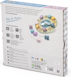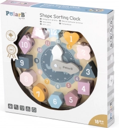 Dětské dřevěné hodiny POLARB kombinují třídění tvarů, skládání čísel a navlékání do jedné všestranné vzdělávací hračky. Dvanáct očíslovaných dílků ve tvaru geometrických tvarů se vkládá do odpovídajících výřezů na ciferníku, přičemž pohyblivé ručičky učí děti rozumět hodinám. Každý dílek má otvor pro snadné provlékání šňůrkou, což přirozeně rozvíjí jemnou motoriku a soustředění.