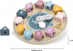 Jasně čitelné číslice, tečkové značení pro vizuální počítání a pastelové barvy podporují rozvoj předškolních dovedností. Bukové dřevo a netoxické barvy zajišťují bezpečí i dlouhou životnost. Hračka motivuje k samostatnému objevování a nabízí mnoho způsobů hry – od řazení čísel 1–12, přes přiřazování tvarů až po první kroky v určování času.