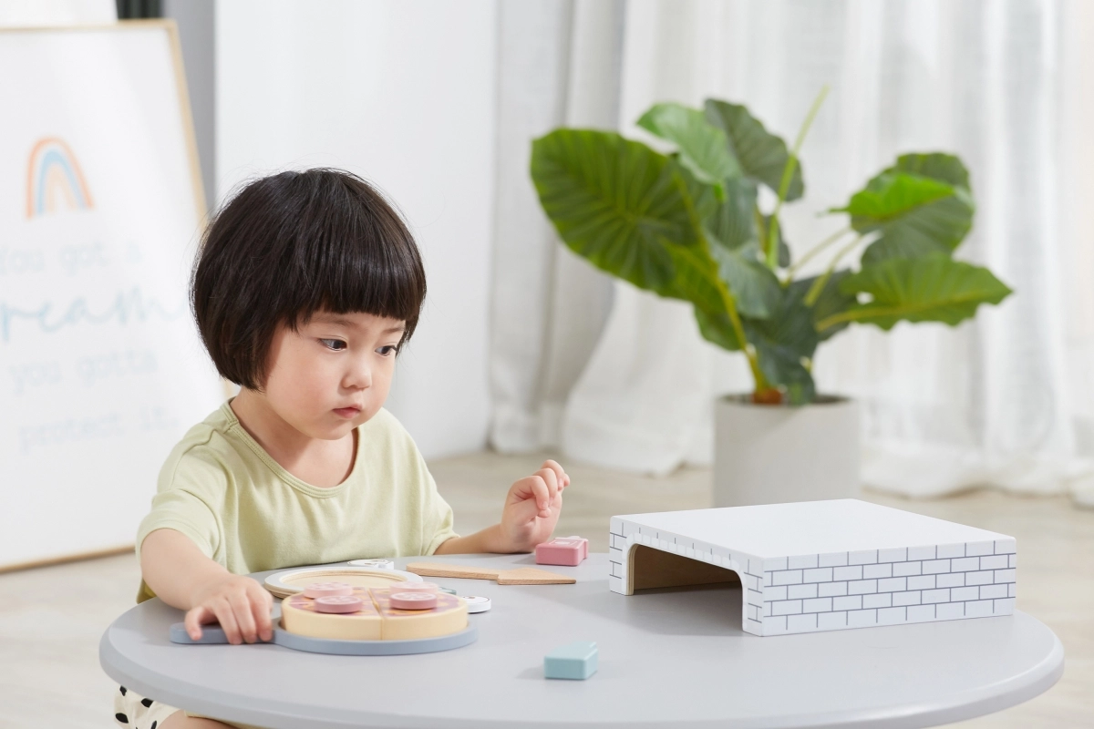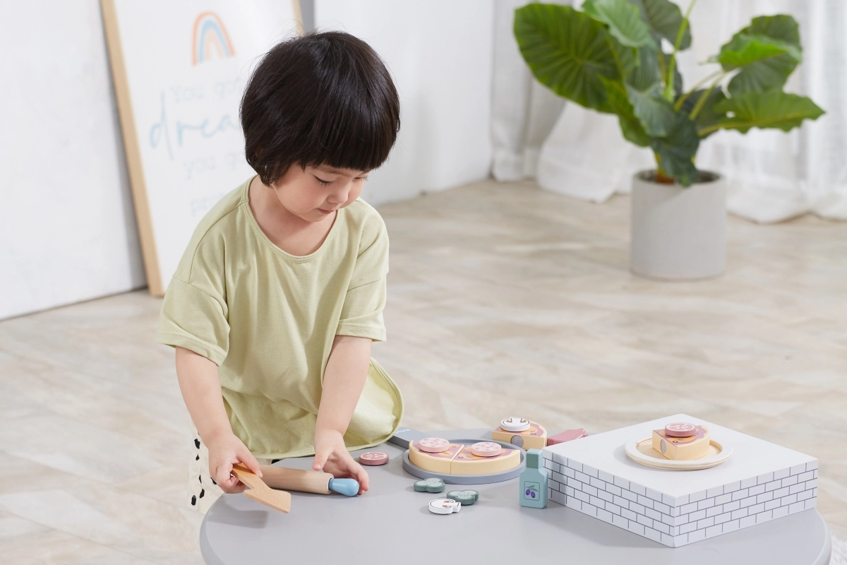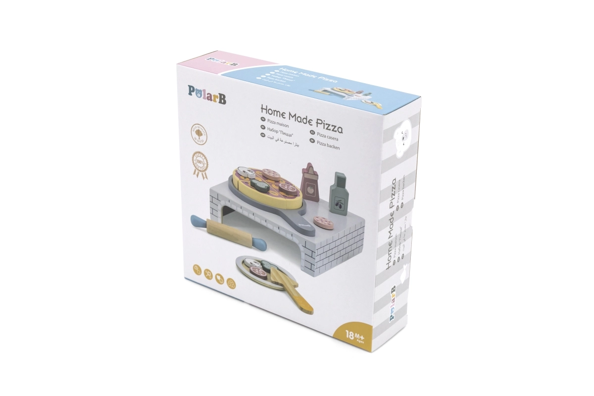 Tato dřevěná sada domácí pizzy promění dětský pokoj v útulnou pizzérii. Děti mohou válet těsto, skládat ingredience, péct v peci a poté servírovat na talířek – vše jako ve skutečnosti. Odnímatelné toppingy a krájecí díly podporují koordinaci oko–ruka a rozvoj fantazie.