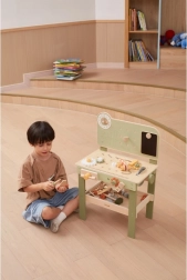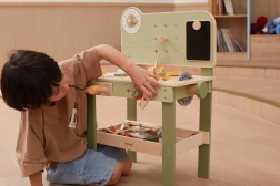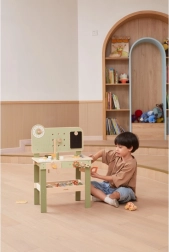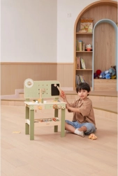 Stylový dětský ponk v přírodně‑zeleném provedení nabízí realistický zážitek z dílny v bezpečné, dřevěné podobě. Děti mohou šroubovat, měnit kolečka u autíčka, "řezat" dílky, skládat ozubená kola a objevovat principy příčiny a následku. Díky přehlednému úložnému prostoru zůstanou všechny díly a nářadí vždy po ruce.