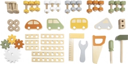 - Bohaté příslušenství: nářadí, šrouby, matice, destičky, ozubená kola, autíčko a hodiny s ručičkami.