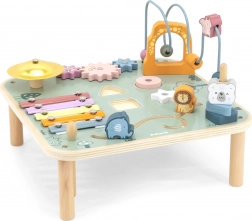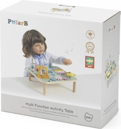 Multifunkční dřevěný stolek VIGA PolarB je dostatečně prostorný, aby si u něj mohlo hrát více dětí najednou. Kvalitní zpracování ze dřeva a kovových vodičů zajišťuje stabilitu a dlouhou životnost. Děti mohou objevovat zvuky na xylofonu i gongu, procvičovat motoriku na korálkovém bludišti, skládat tvary do správných otvorů a zkoumat principy ozubených koleček.