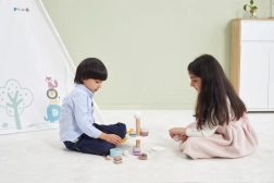 Hra na čajový dýchánek rozvíjí komunikaci, fantazii a spolupráci mezi dětmi. Barevné dortíky lákají k třídění a počítání, šálky a lžičky podporují koordinaci oko–ruka a jemnou motoriku. Elegantní design v jemných barvách pěkně zapadne do každého dětského pokojíčku.