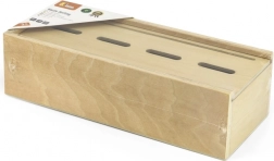 Hračka učí děti správnému třídění odpadu s využitím hravých dřevěných destiček a barevně označených košů.