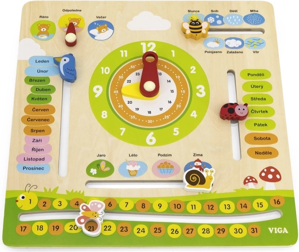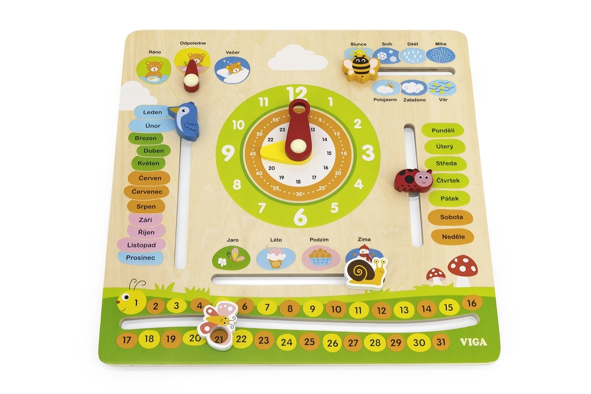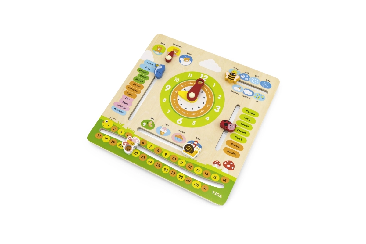 Chytrý a zábavný dřevěný kalendář VIGA v českém jazyce pomáhá dětem hravou formou učit se měsíce, dny v týdnu, hodiny, roční období, počasí, čísla a části dne. Pohyblivé ručičky a ukazatele podporují jemnou motoriku a samostatné objevování.