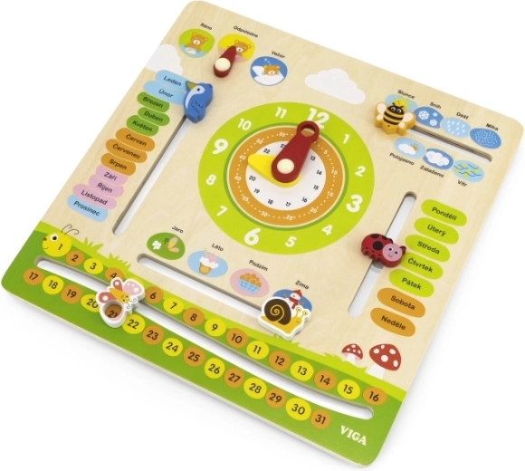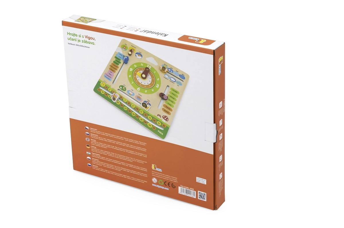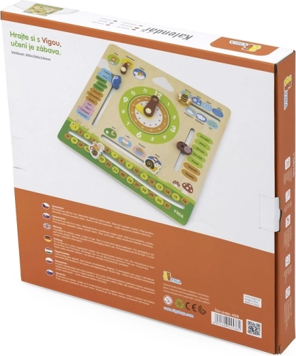 Dřevěný kalendář VIGA je edukativní pomůcka pro předškoláky, která propojuje učení a hru. Díky přehlednému rozložení a českým popiskům si děti snadno osvojí základní pojmy z každodenního života. Pohyblivé prvky – hodinové ručičky, ukazatel počasí a ročních období – povzbuzují aktivní zapojení a rozvíjejí jemnou motoriku.