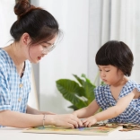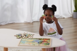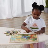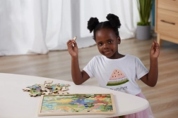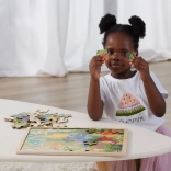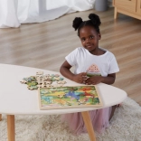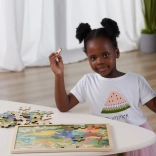 Pevný dřevěný podnos udržuje dílky na místě, usnadňuje přenášení i ukládání a pomáhá dětem soustředit se na skládání obrázku.