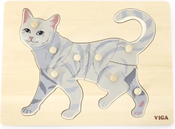 Úkolem dítěte je složit obrázek kočky nejen podle ilustrace, ale i podle tvaru jednotlivých dílků. Knoflíkové úchytky usnadňují uchopení malými prsty a podporují správné vedení ruky. Pevná dřevěná deska drží dílky jistě na místě a odolá každodennímu používání.
