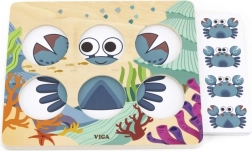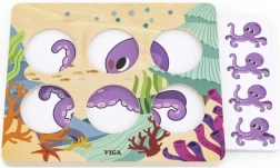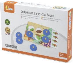 Set obsahuje 10 oboustranných karet (20 motivů) s mořskými živočichy a dalšími obrázky. Děti hádají, ke kterému z nabízených obrázků patří ukrytý prvek – když si nejsou jisté, odhalí další nápovědu zvednutím žetonu. Kvalitní dřevěné provedení a netoxické, ekologicky šetrné barvy zajišťují bezpečnou hru pro nejmenší.