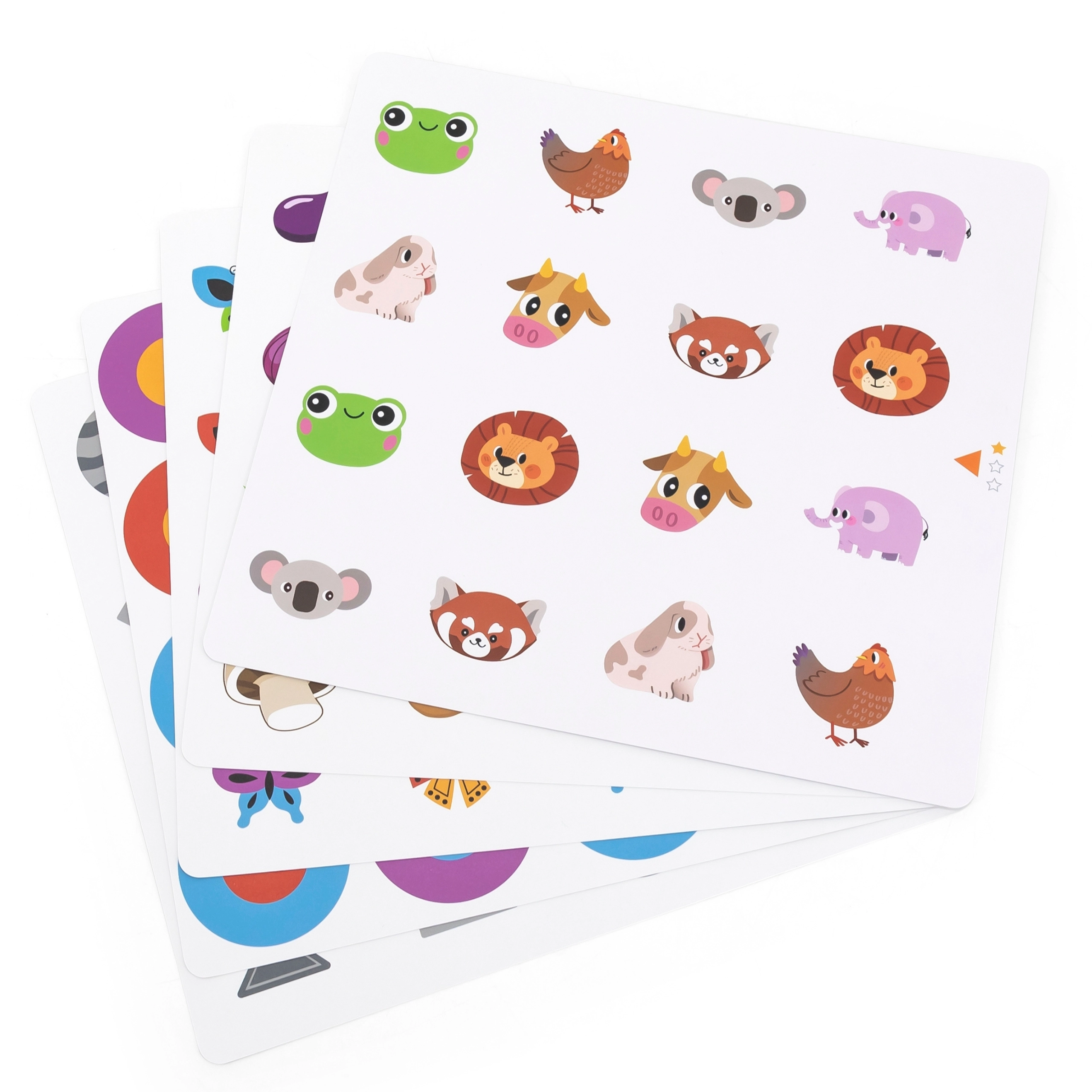 Součástí je 10 oboustranných karet s rozmanitými motivy (zvířata, předměty, rostliny). Jednoduše je vyměníte a přizpůsobíte témata i obtížnost věku dítěte.
