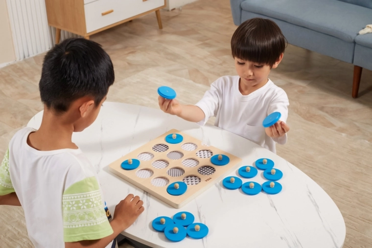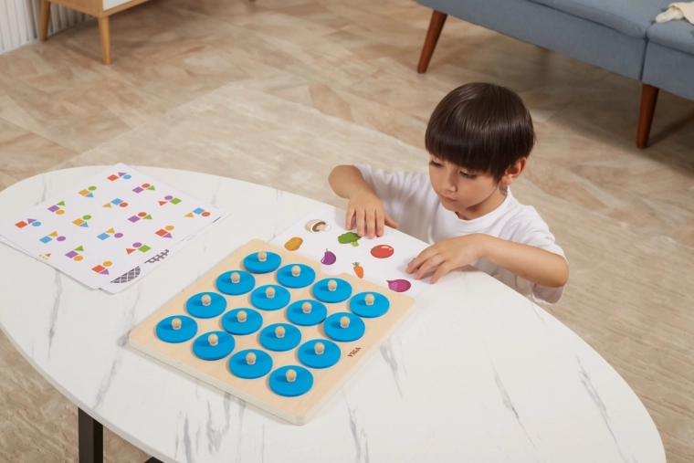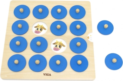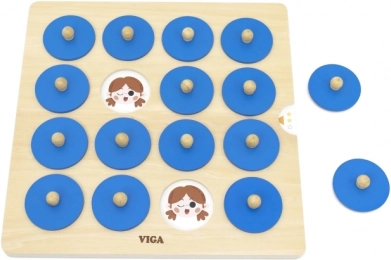 Tato kvalitní dřevěná paměťová hra od značky VIGA je skvělým způsobem, jak u dětí podporovat kognitivní rozvoj a vizuální vnímání. Dítě zvedne modrý dílek za dřevěný knoflík, zapamatuje si obrázek a hledá druhý stejný – jednoduchá mechanika, která baví i učí.