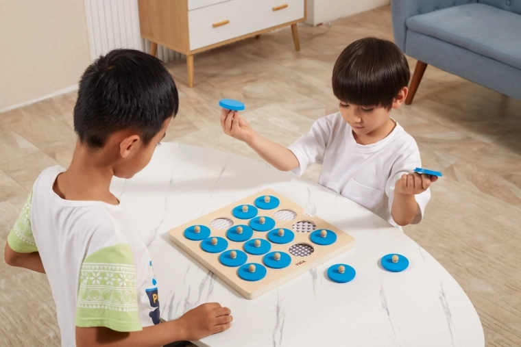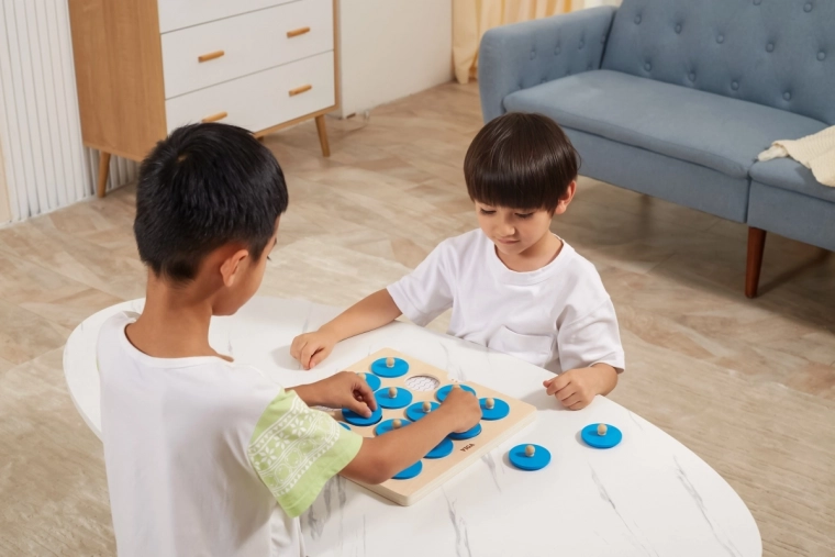 - Snadné uchopení: dřevěné knoflíky na modrých žetonech pro malé dětské ruce.